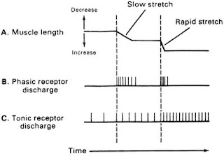 -کشش عضله.اگر کشش عضلانی به صورت آرام و نگه داشته شده اعمال گردد،حساسیت اندام وتری گلژی نسبت به گیرنده های دوک عضلانی بیشتر بوده و با تحریک زیاد Ib،عضله تحت کشش مهار می گردد.بدین ترتیب،عضله مربوطه می تواند تحت کشش بیشتری نیز قرار گیرد.