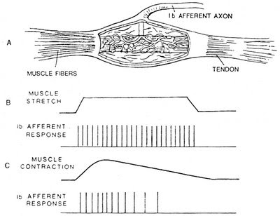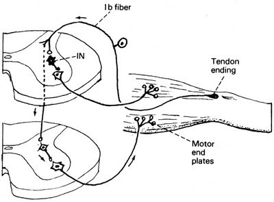 -انقباض عضله.هنگامی که انقباض عضلانی به کاهش طول می انجامد،بخش وتری یا تاندونی عضله کشیده می شود که باعث تحریک بیشتر اندام های وتری گلژی شده و متناسب با کشش ایجاد شده،پیام های زیادی از طریق فیبرهای حسی Ib به نخاع ارسال می گردد.نتیجه ارسال این پیام ها به دستگاه عصبی به خصوص در زمان هایی که تانسیون عضله به میزان زیادی افزایش می یابد،مهار عضله مربوطه جهت جلوگیری از آسیب خواهد بود.